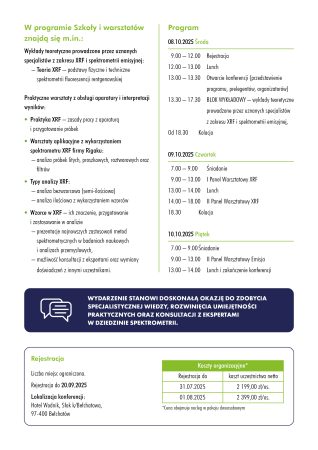 Testchem-SiW-2025-ulotka-A42 8 września, 2025 @11:31 Nawigacja wpisu Szkoła i Warsztaty z Fluorescencyjnej Spektrometrii Rentgenowskiej oraz Spektrometrii Emisyjnej.